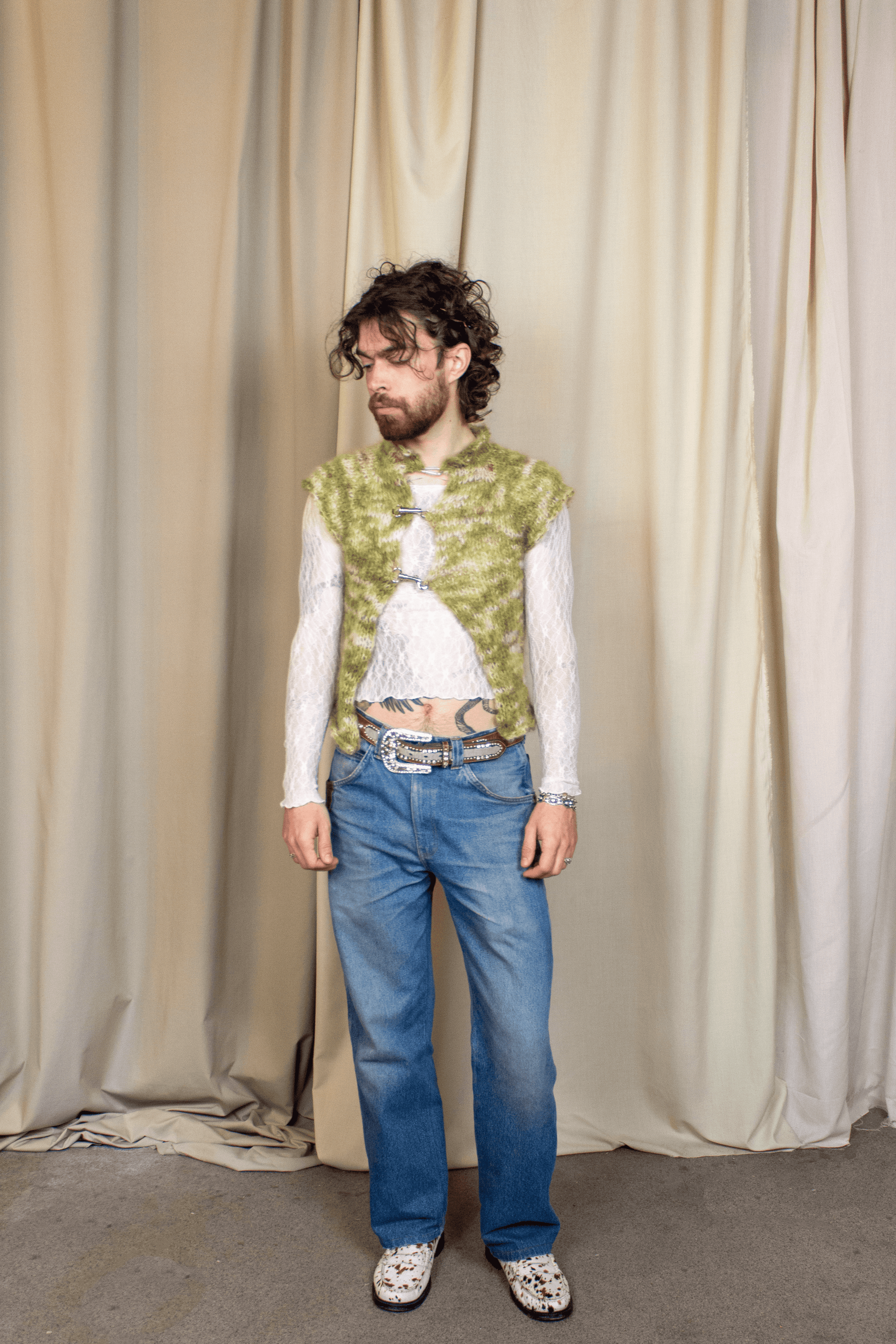 Mohair T-shirt er en let og luftig t-shirt med cardigan-lignende detaljer. Den er strikket i blød mega-mohair og lukkes med karabinhager foran, hvilket tilfører et råt twist til det ellers bløde og drømmende materiale. En top der kan styles med åbningen både i fronten og i ryggen, som lag over en trøje eller alene.
