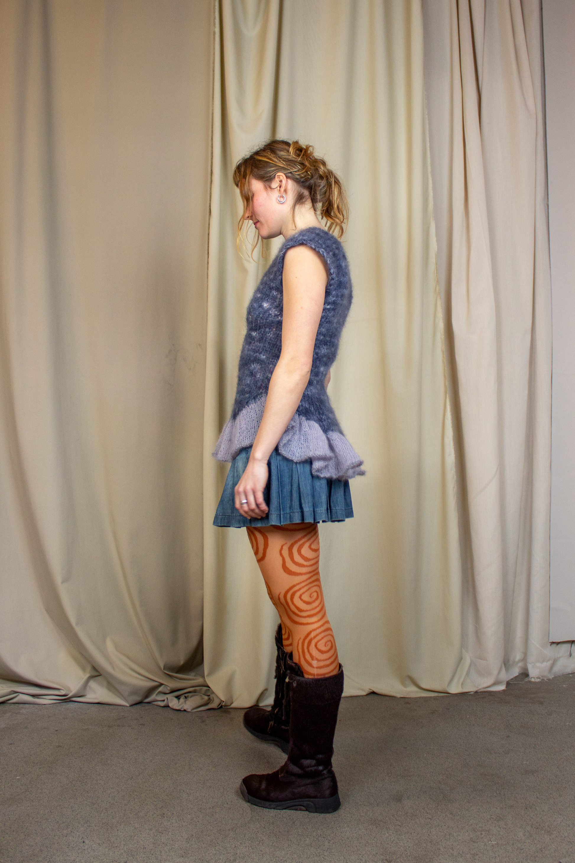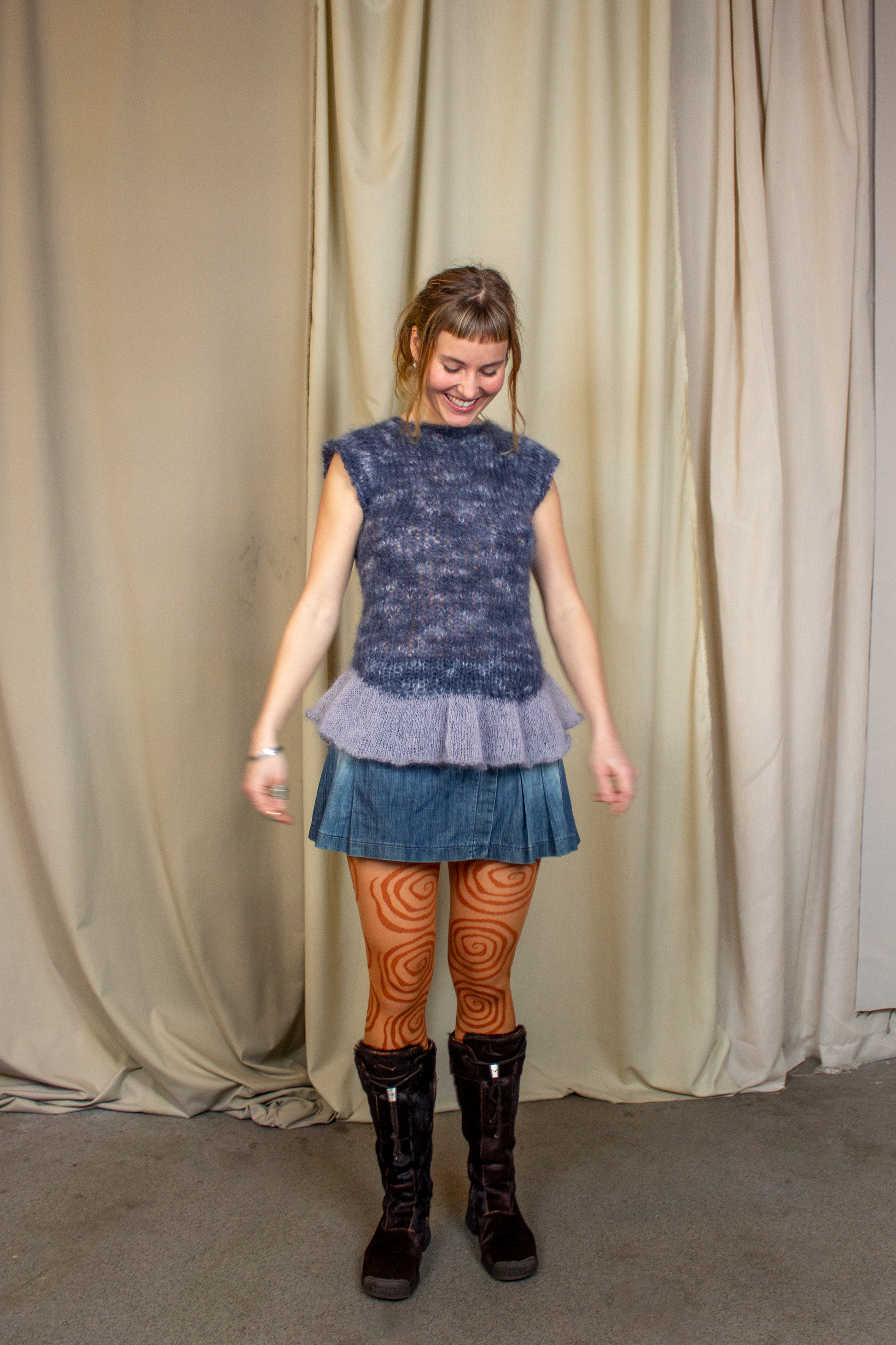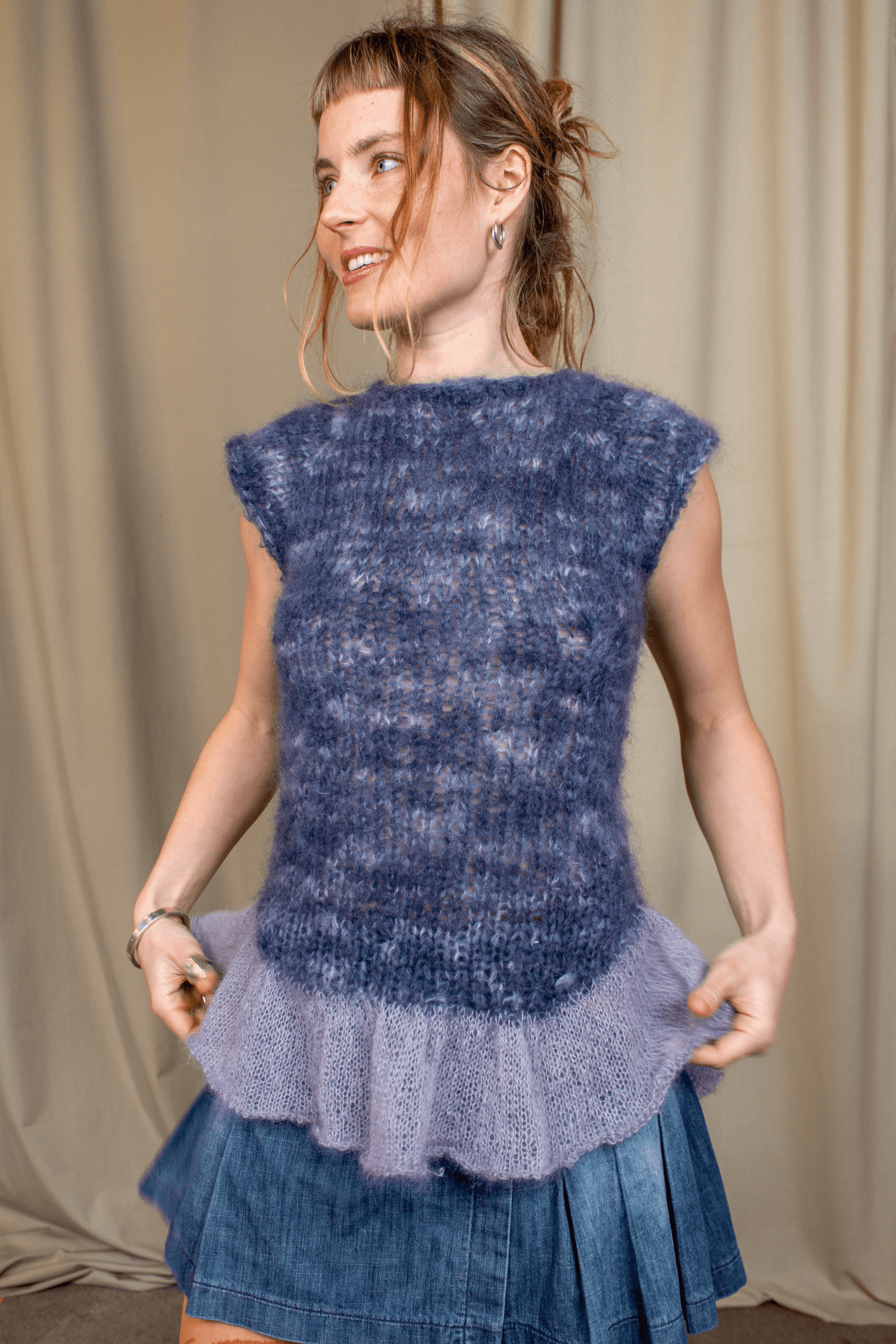 Purple Princess Tee er håndlavet af håndfarvet fat mohair bestående af 78 % kid mohair, 13 % merinould og 9 % nylon. Den lille forlængende skørt er lavet af kid silk mohair.