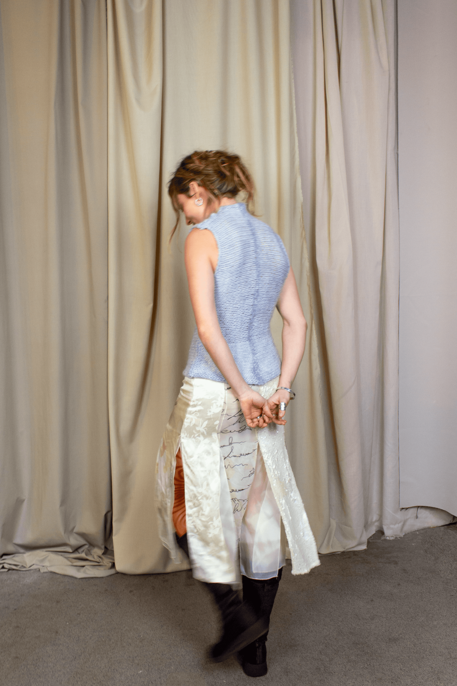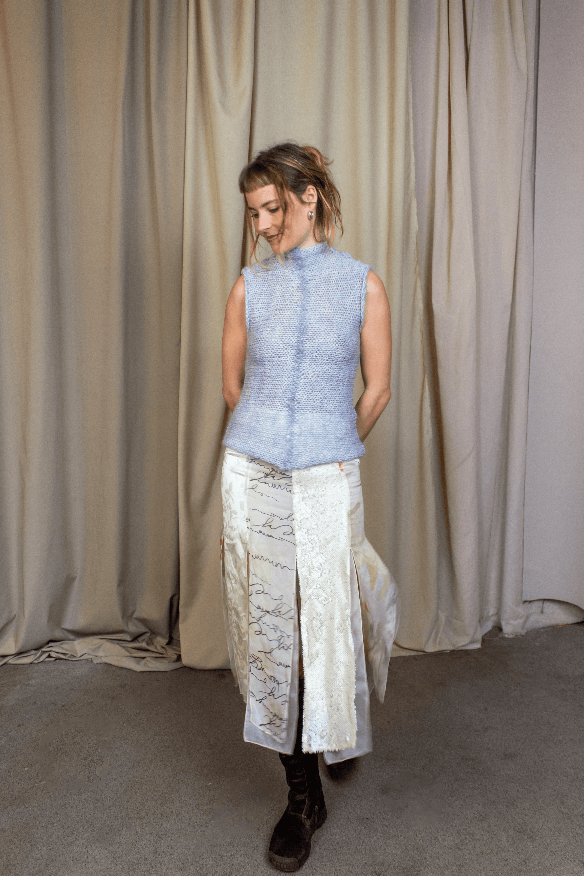 Spine Top #1 er håndlavet af 100 % uld. Striben i midten er bouclé lavet af mohair.